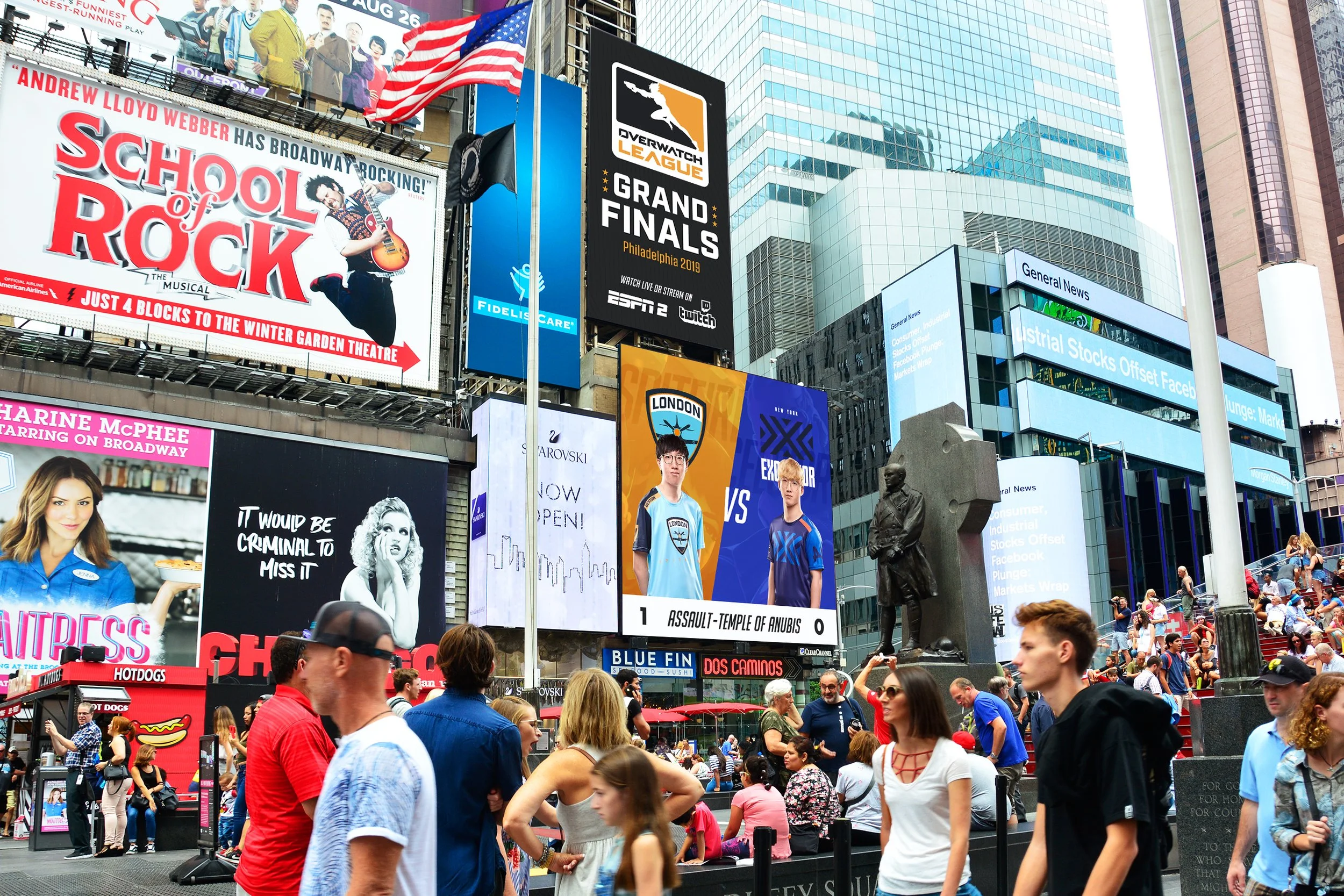 The objective was to create mockups for digital advertisements showcasing the Overwatch League. These mockups featured various teams, with a spotlight on the New York Excelsior, primarily displayed in the CCO's Times Square digital takeover. The London Spitfire, the team that became the 2018 champions, were chosen as the opposing team. Houston, TX and Los Angeles, CA were also selected to demonstrate diverse color capabilities on the prominent digital unit in Times Square. The digital units presented live score updates and looping images of athletes representing their in-game characters in real-time. Additionally, a wallscape unit mockup highlighted the potential of augmented reality technology.